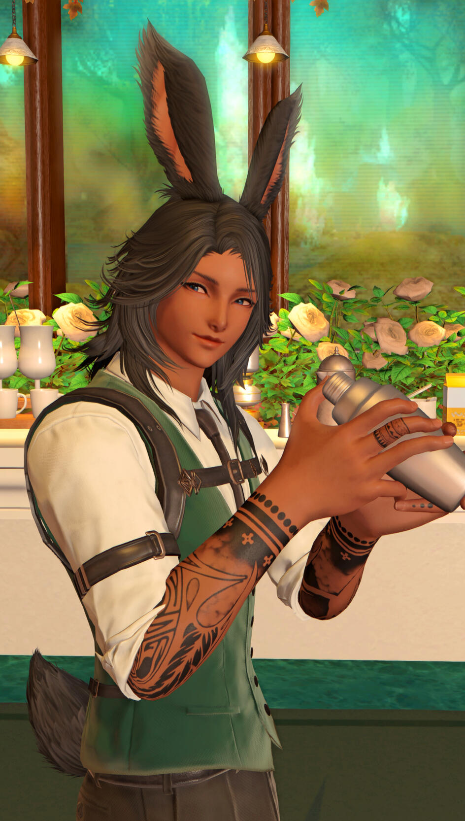 A seasoned bartender, Lio has been slinging cocktails and brewing coffee at a variety of bars, speakeasies, and cafes throughout Eorzea since he arrived a decade or so ago, including his very own venue Tipsy Whispers, which he shares in with his darling buntender every Wednesday night.